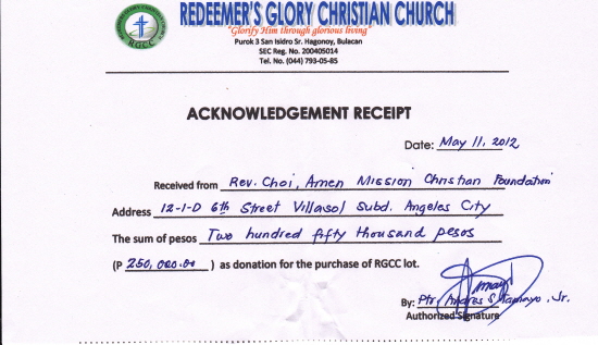 준비하신 25만 페소를 합하여 합계 50만 페소를 대지 구입비를 위해