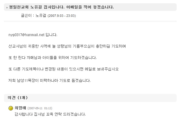 봉일천교회 노유걸 집사입니다. 이메일을 적어 놓겠습니다.