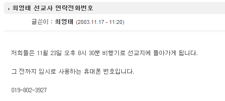최영태 선교사 연락전화번호