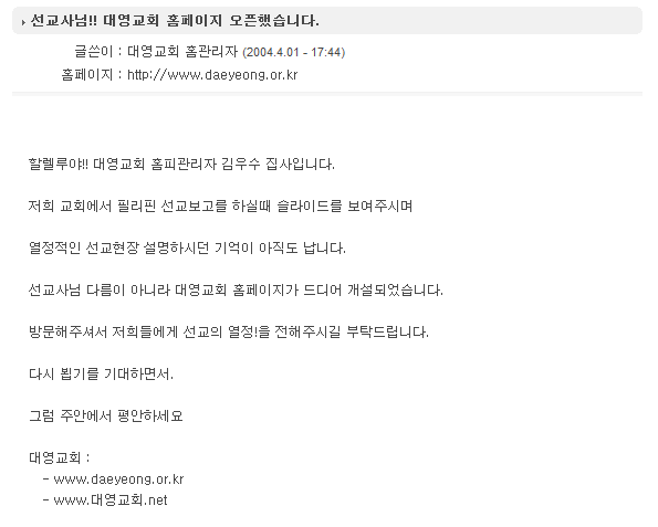 선교사님!! 대영교회 홈페이지 오픈했습니다.